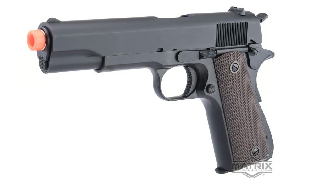 El marco y la corredera de metal resistente y completo brindan una apariencia y sensación realistas. Miras delantera y trasera A1 Estrías deslizantes traseras para facilitar el montaje Cómodas placas de agarre de polímero con diseño de rombos para un mejor manejo Equipado con un anillo de cordón en la parte inferior de la empuñadura. Seguridad del pulgar y seguridad del agarre Especificaciones: Longitud: 220 mm x 140 mm Peso: 850 g Cargador: 25 rondas, compatible con Tokyo Marui, KJW, King Arms y otras pistolas Airsoft con retroceso de gas de la serie 1911 Gas: gas verde Modos de disparo: semiautomático, seguro Velocidad inicial: ~0,84 julios (probado con BB de 0,20 g) Sistema: retroceso de gas Hopup: sí, ajustable El paquete incluye: pistola, cargador Fabricante: Matrix x Golden Eagle Rango de FPS: 270-300